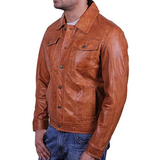 MEN'S CASUAL SHIRT COLLAR TAN BROWN LAMBSKIN LEATHER JACKET